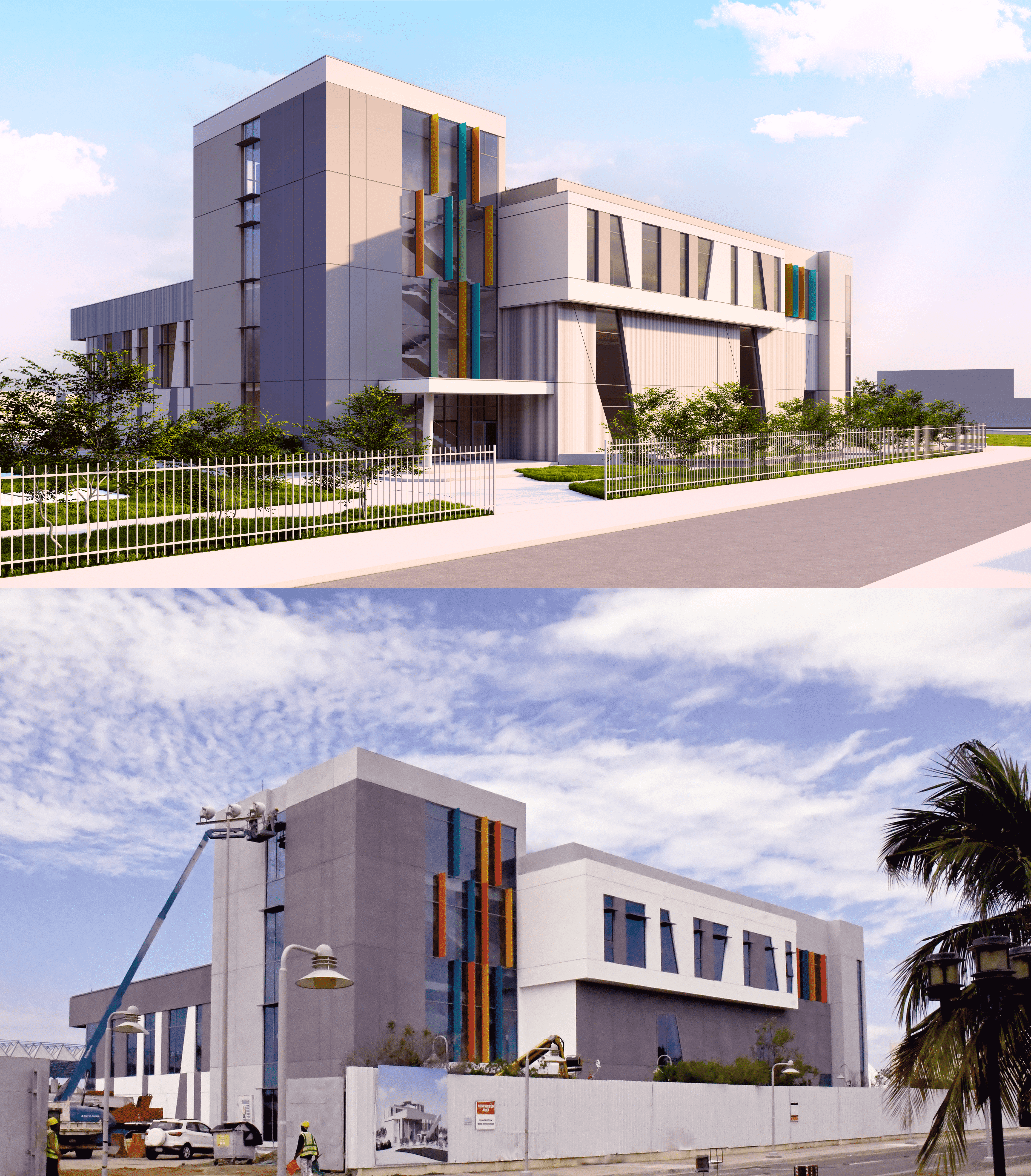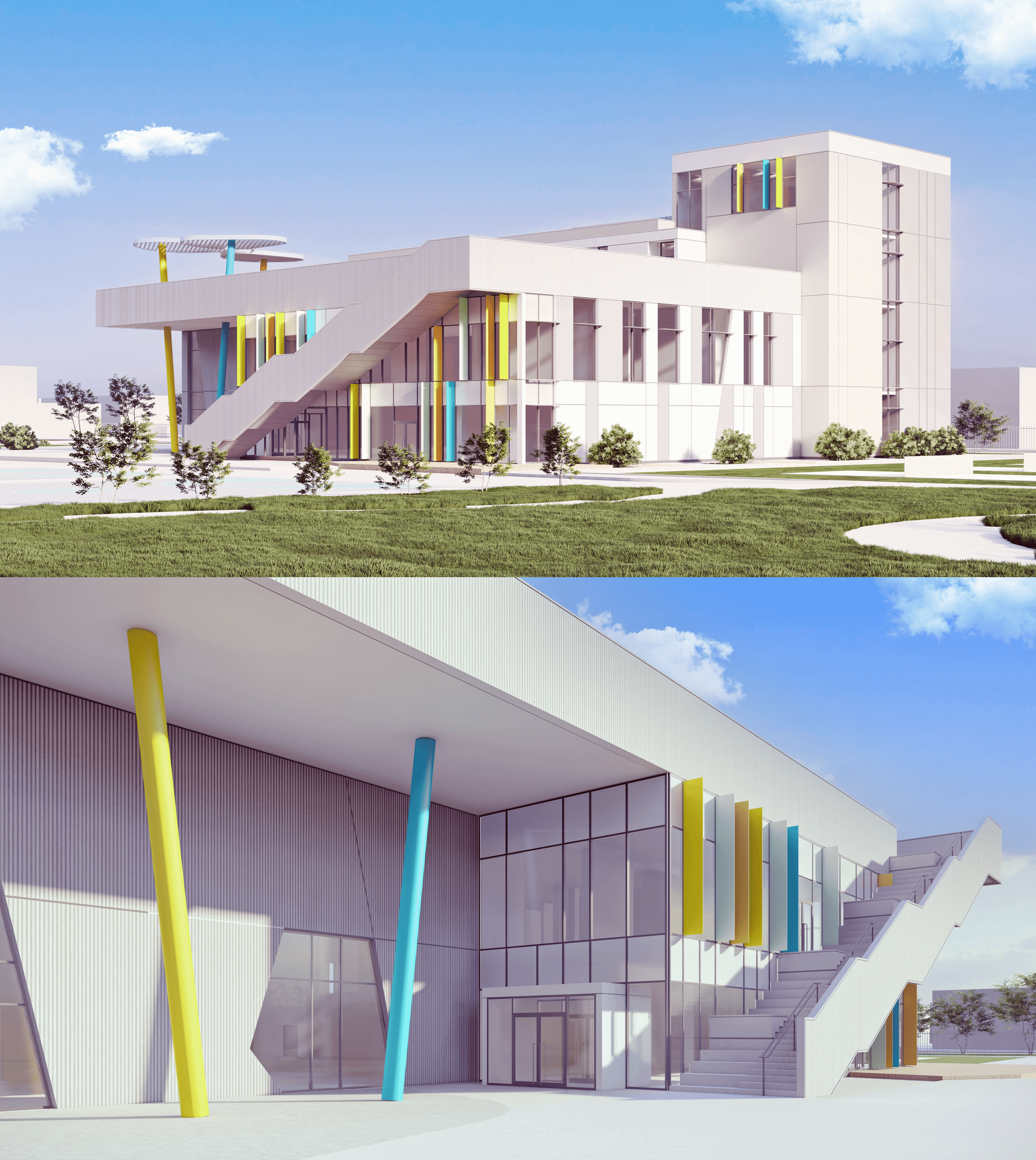 - The building is containing sports facilities and GYM, learning facilities, landscape, and outdoor activity areas.